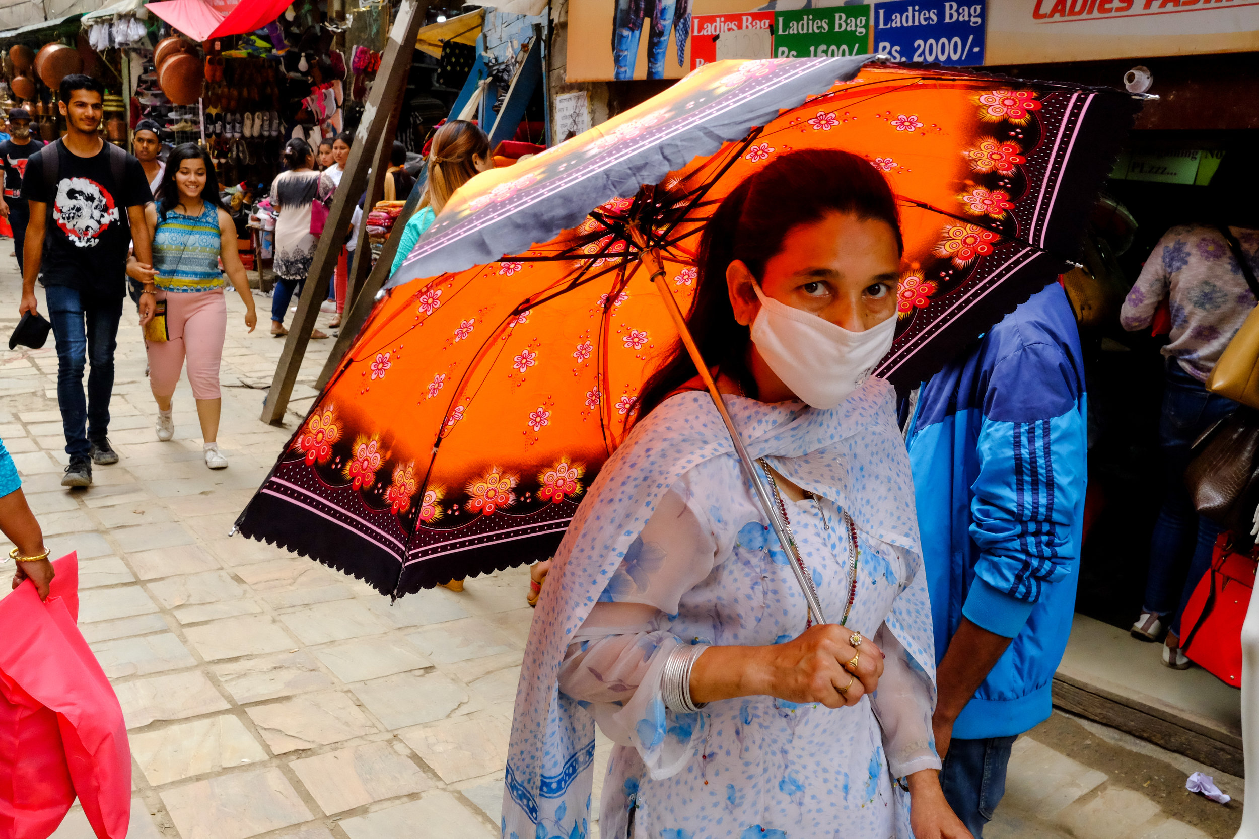 One benefit of visiting Nepal during rainy season is the use of colourful umbrellas. I didn't see a dull coloured brolly during my six day visit and this creates an interesting background for subjects as they shop.